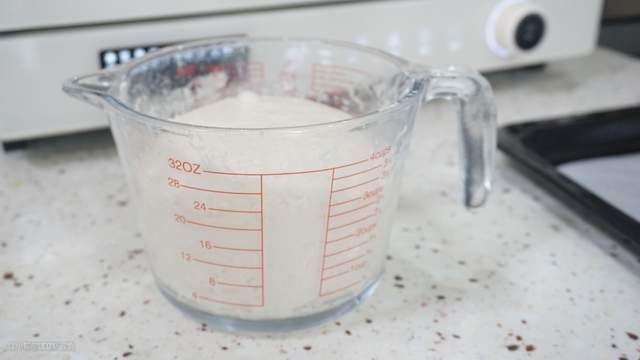 冰箱冷藏12小时左右,可以看到面团已经有原来两倍大小了,这个时候已经不沾手了,已经充分的发酵,这时先不急着操作,室温下静止40分钟左右。
