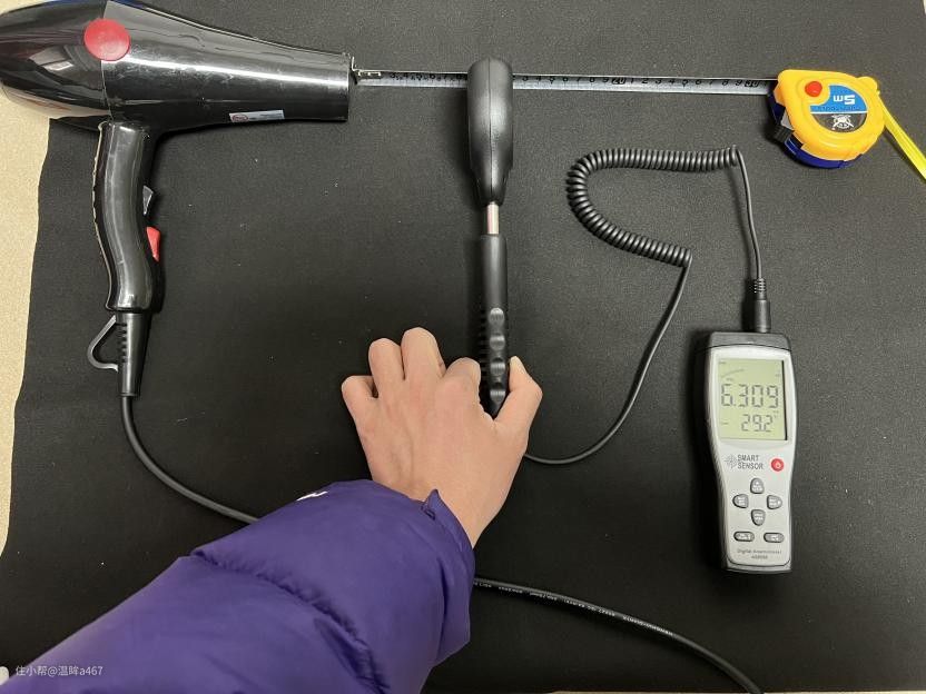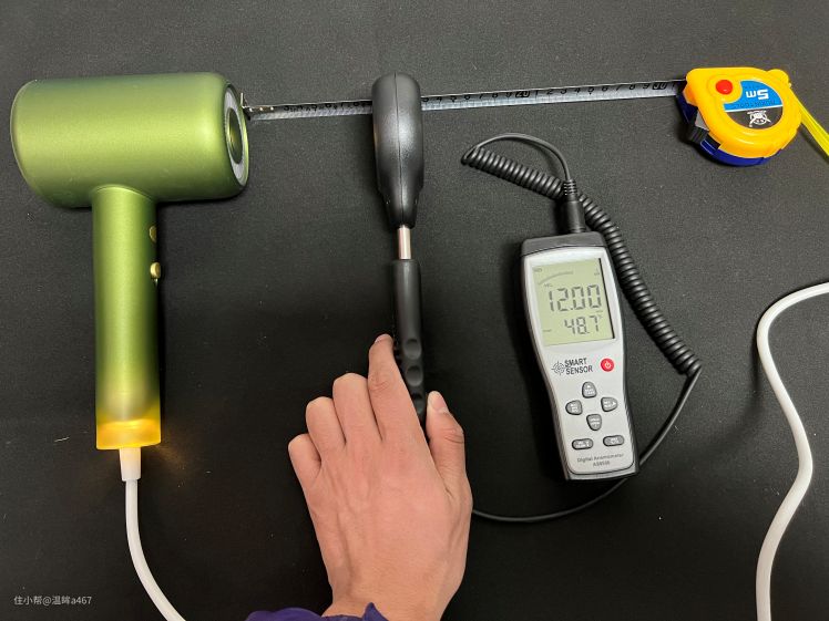 为了对比直白水离子吹风机的风力,我找来了家里以前买的闲置了的便宜吹风机进行对比测试,实测在开启后一段时间后,风力变得稳定的时候,直白的风速是12m/s,风速还是很快的,在这个风速下,我女朋友吹干长头发大约只需要4分钟左右。