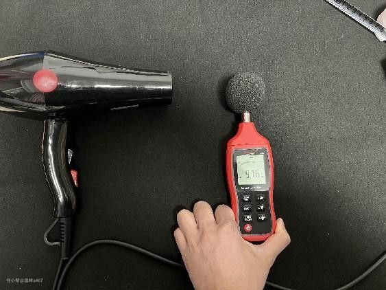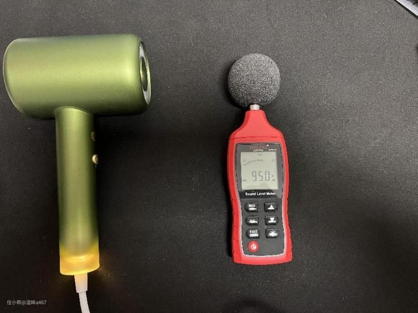后面就是大家非常关注的噪音环节,实测直白水离子吹风机开到最大档位,在离出风口10cm的位置噪音为95dB,普通吹风机为97.6dB。相对而言两台吹风机噪音都比较大,但是因为我们的测量距离离出风口很近,实际人耳接受的噪音并不会有这么夸张,从我整个测试的观感来说,我觉得属于可以接受的范畴。
