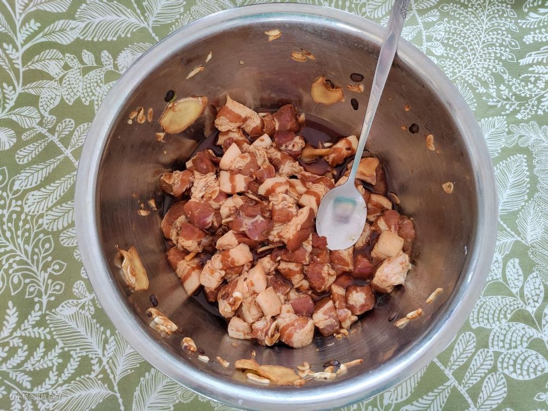 先切一些五花肉腌好。