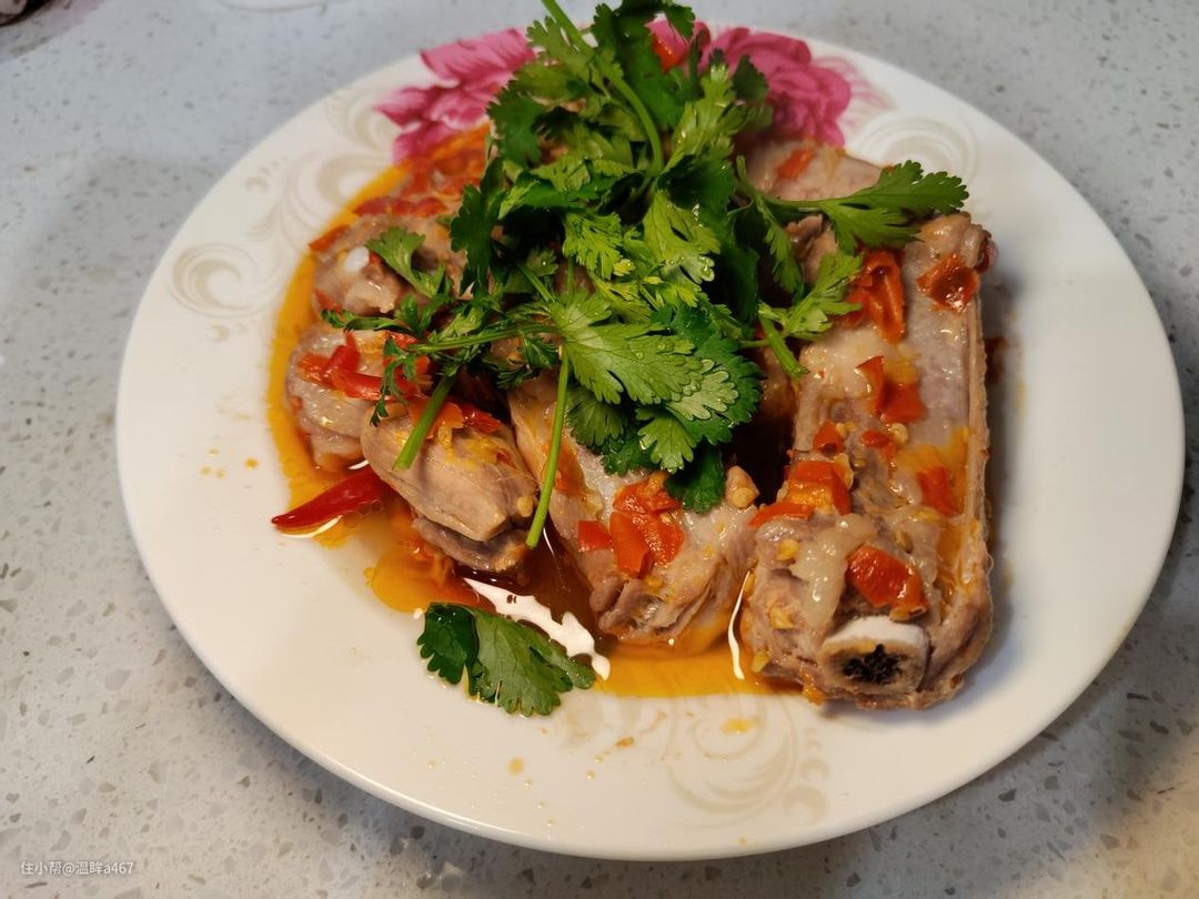排骨出锅后,我又扯了一些香菜洒在上面,吃的时候别有一番风味。