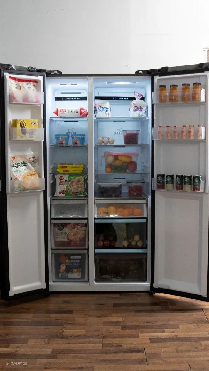 宽一米左右,高1.8m,深度0.7m左右,毛重接近110kg,基本保证了冰箱的容积充足,事实也确实是这样:600L的超大容量完全可以满足一家三口的日常所需。