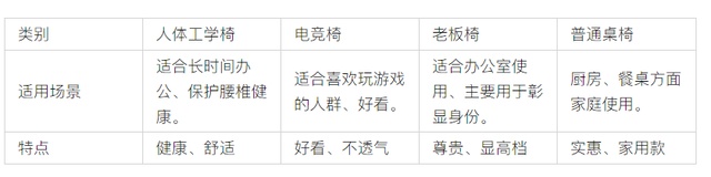 其实细细观察下来,大家可以发现生活中的椅子大部分分为以下几款椅子:人体工学椅、老板椅、电竞椅以及普通椅等。