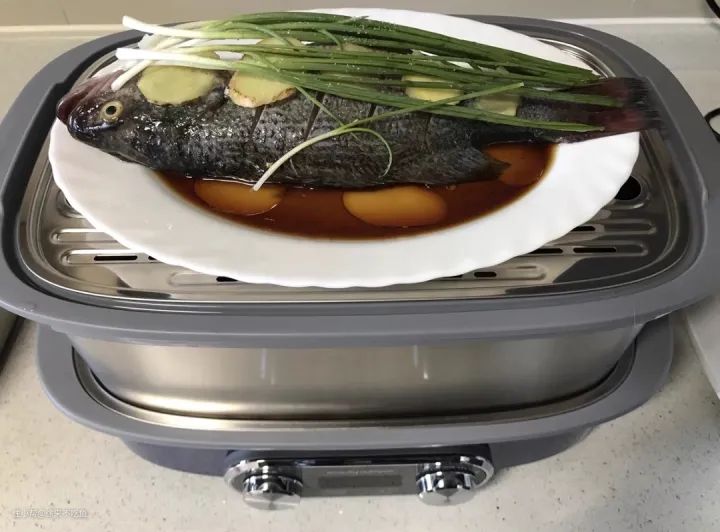 第二层放上一整条鲈鱼,电蒸锅的独特设计让盖子上的冷凝水不会下落到食材中,这样就避免了传统蒸锅涉及到冷凝水回流造成的味道稀释问题。
