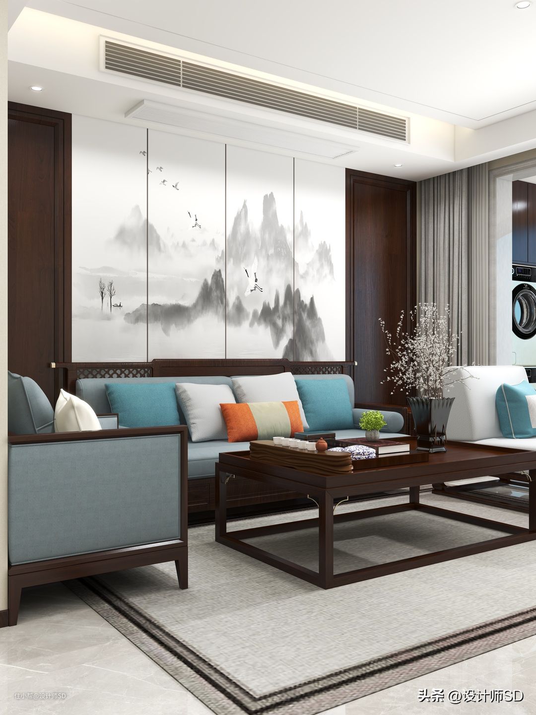 沙发也做了造型背景墙,两端对称的胡桃木墙板,搭配中间的用硬包定制的水墨山水画,简单有韵味,简约的新中式布艺沙发,胡桃木的框架搭配蓝色系的布垫,几个抱枕的跳色让整个客厅都显得大气舒适。