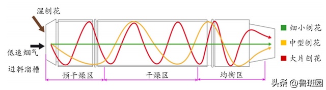 在干燥机内部拨料铲和气流的双重作用下,中型刨花呈自由悬浮状态完成干燥;而大片刨花则沿着干燥机的内壁转动完成干燥,相对于中小刨花而言其在干燥机内停留的时间和所经过的路线相对较长,从而使最终从干燥机出来的刨花含水率均匀一致。