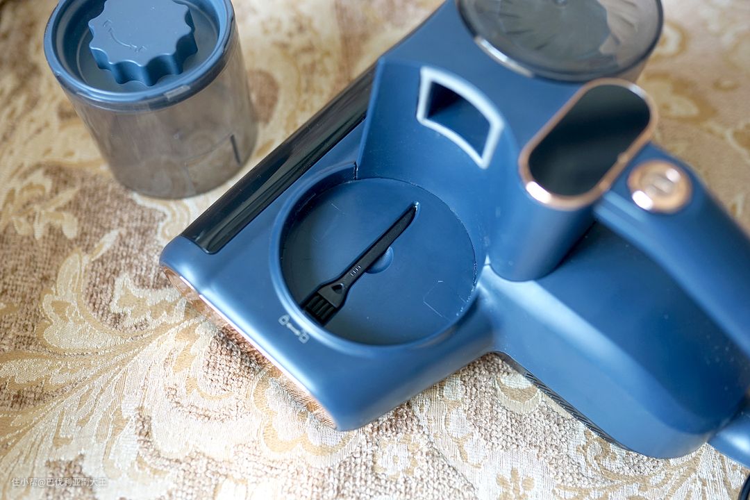 另外我还发现一个小细节,拿起尘杯后可以看到一个隐藏式清洁刷,解决了配件收纳问题,赞!清洁刷是双头设计,尖头清理头发,刷头清理灰尘。