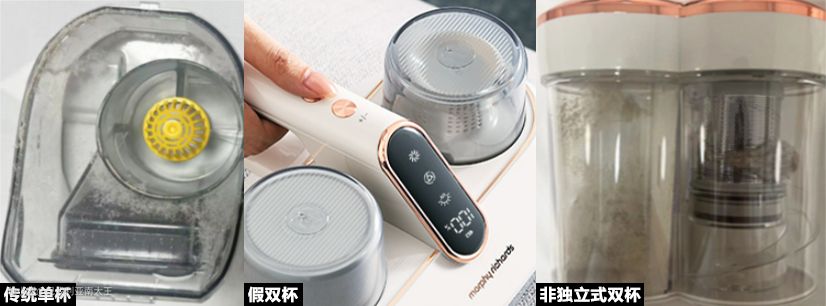 再次购买时发现除螨仪已经升级为双杯设计,但这其中还得擦亮双眼,比如假双杯就不行。它是其中一个杯体为尘杯,另一个杯体为电机,不可拆卸,这和传统单杯没啥区别。