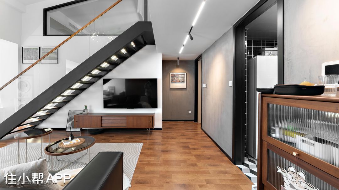 楼梯坡度与下方的白墙正好构成了一面三角形的电视背景墙,布局紧凑又灵动个性。