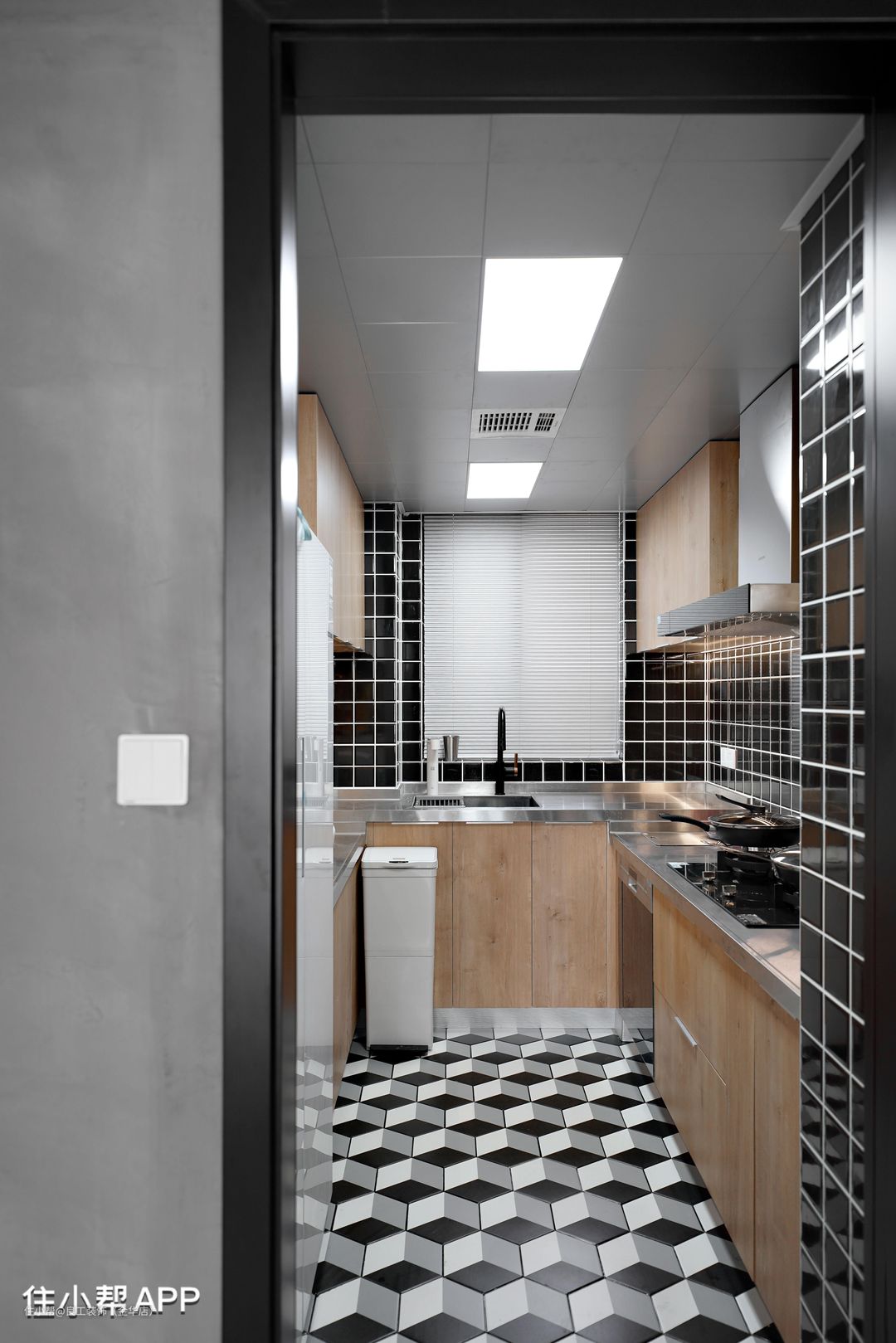 厨房柜体采用原木打造,拥有醇厚质朴的自然气韵。墙面和地面分别采用不同几何图案的小黑砖,凸显雅酷个性。在细节中注入变化,有助于提升空间的品质感。