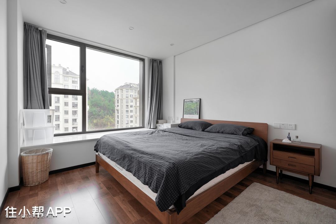 次卧包括睡眠区和书房区,拓展了卧室的基本功能。墙面全部粉刷成了水泥灰,腔调了工业风的属性,与白色顶面和原木地板共同营造出了平衡冷冽的空间调性。
