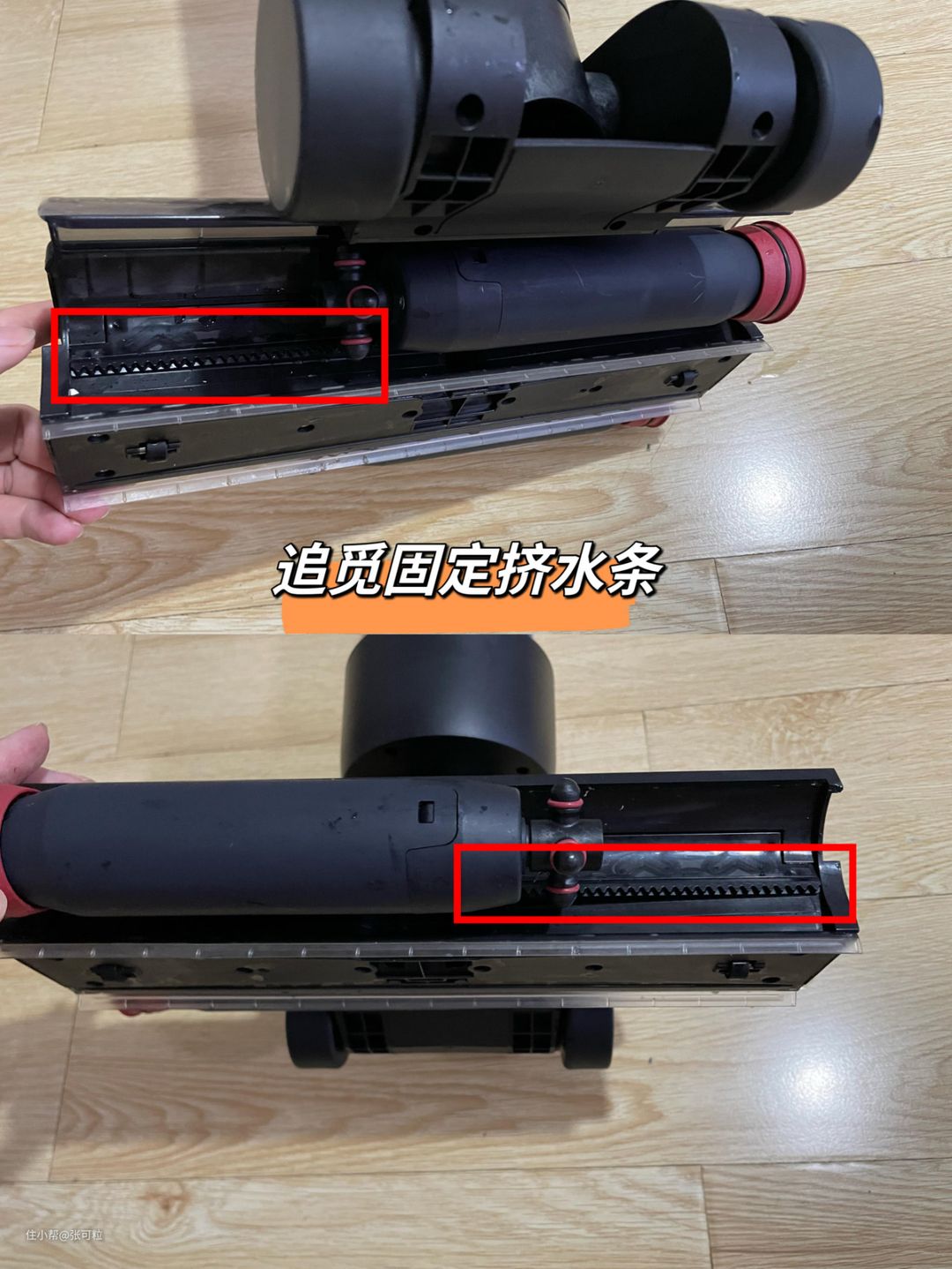 为了帮助大家捋清影响洗地机清洁效果的原理,粒子进行了拆机测试。 首先来对比一下,两台机子的浮动挤水条。