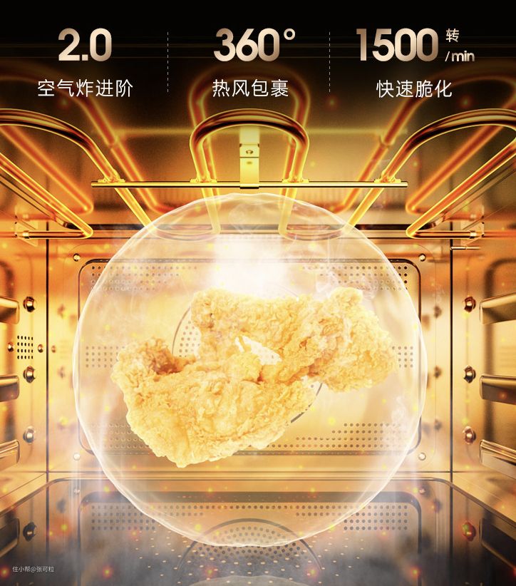 比如微热风烤(微波+热风烤):空气炸进阶2.0版本,内外360°更均匀,脱脂率高达98.6%。