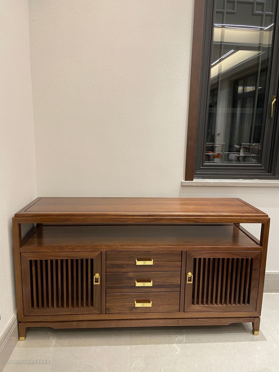 这一系列的新中式家具皆采用黑胡桃木作为材料,通过精湛的木工技术,最大程度上将木料的特点展现出来。新中式矮柜在设计上多处采用镂空的设计,减少了木质带来的厚重感;边柜设置中空隔层,方便收纳,下面柜门做镂空格栅样式的设计,中式元素丰富;玄关柜与衣帽架的搭配十分经典,玄关柜圆形格窗样式的镂空设计与黄铜色的把手,同样是经典的中式元素的搭配。