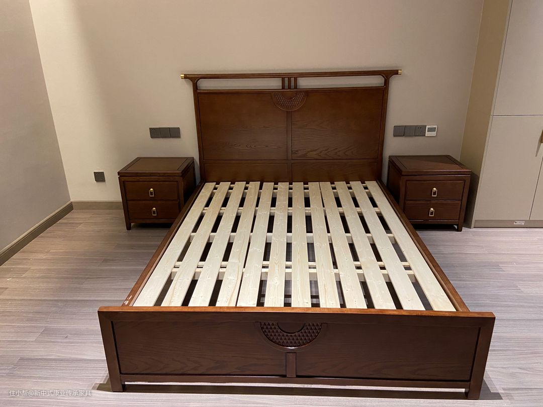 木质床架的床头板上雕刻有半圆形的玉环图案,与床尾上的图案遥相呼应,组合为一个完整的圆,富有圆满的寓意;两侧的实木床头柜小巧简洁,金色的铜扣拉手又为其增添了一份贵气。