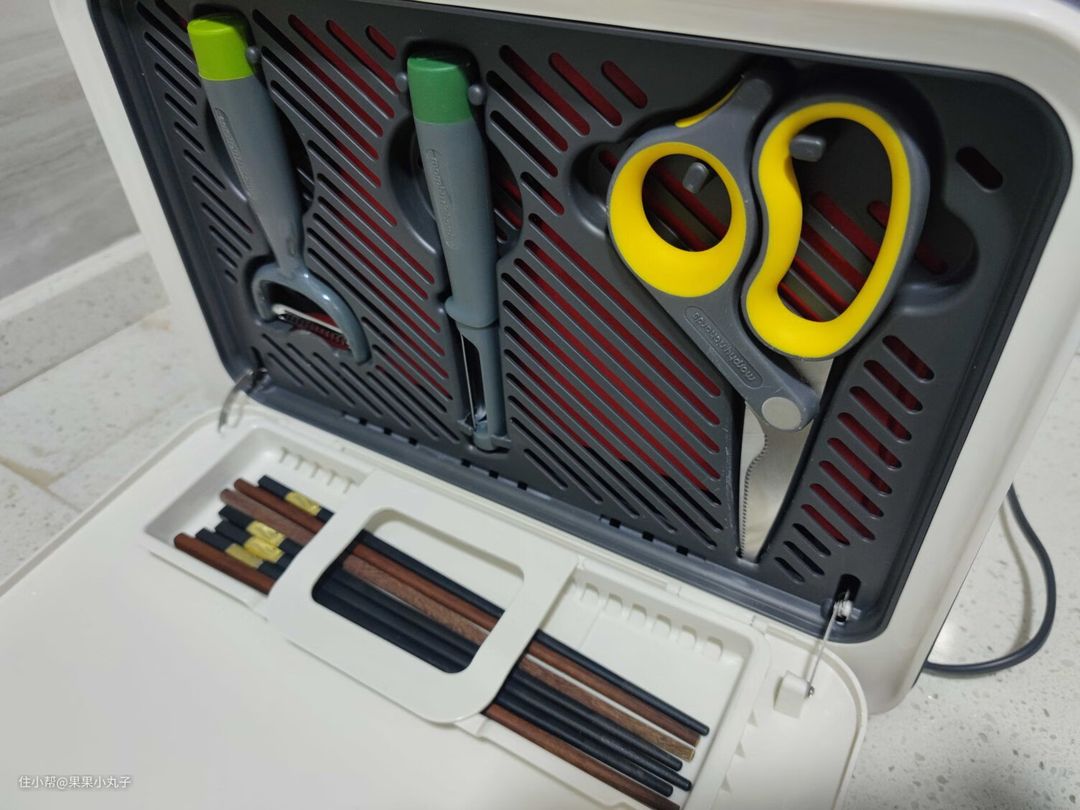 新一代的摩飞消毒刀架增加了筷笼,将筷子都安排的妥妥的,整洁有序,尤其适合一家三口,或者上班族。如果没有消毒柜的情况下,有此刀架可以让整个厨房确实整洁不少。