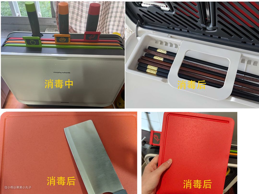 消毒和烘干前,刀具和砧板有气味和水渍,在消毒和烘干后,可以看到砧板和刀具如初次使用时一样崭新,而且进过紫外线消毒后砧板已经没有异味了。