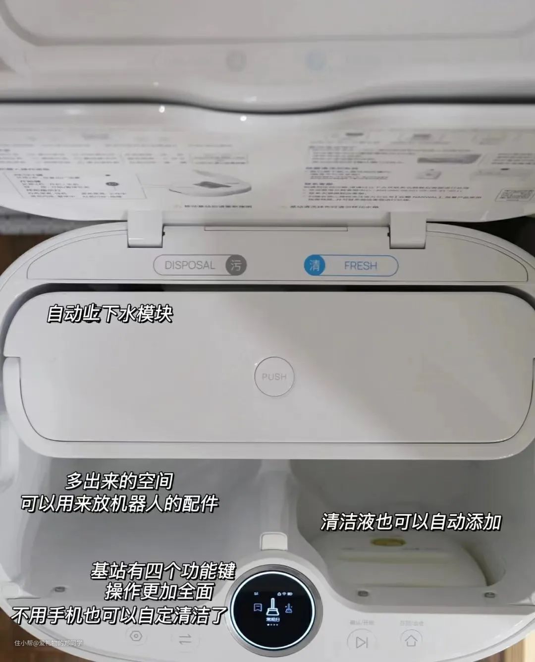 这一款的基站自带自动添加清洁剂功能,清洗拖布时,清洁剂会沿着水管在水管里和清水混合然后喷到拖布上面,机器人在清洗拖布的时候,基站可以添加清洁剂,智能控比,完全不用担心,