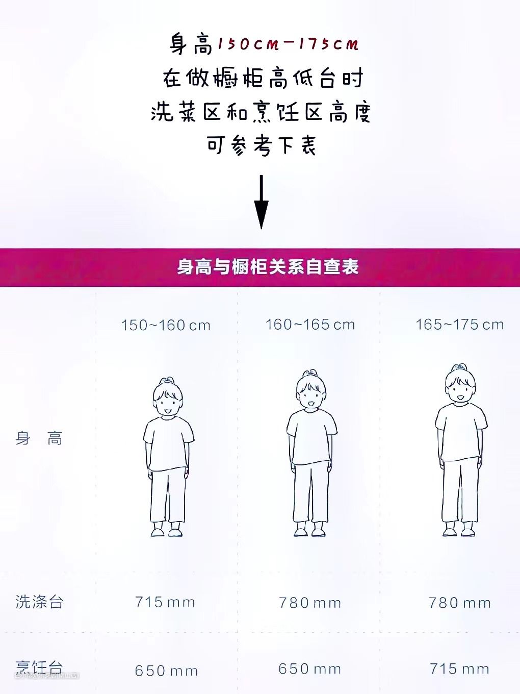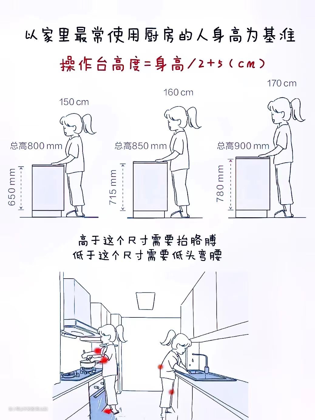 以家里最常使用厨房的人的身高做为基准,计算高度是:操作台高度=身高/2+5(cm)。就比如身高150cm,操作台是650mm,总高800mm、身高160cm,操作台是715mm,总高850mm、身高170cm,操作台是780mm,总高900mm这样最合适,高于这个尺寸需要抬胳膊,低于这个尺寸就需要低头弯腰了。