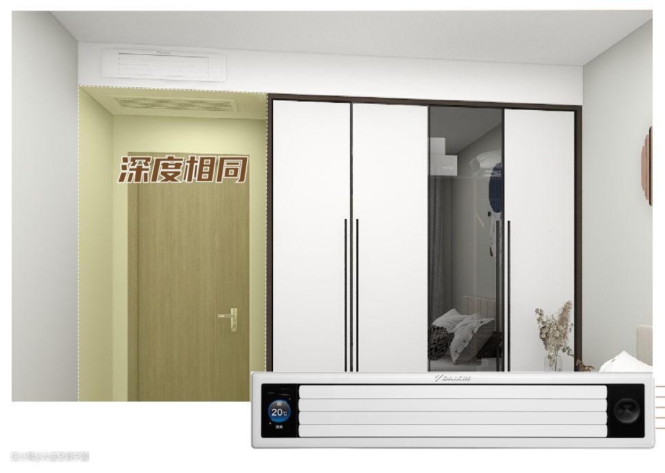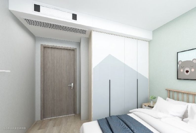 安装【大金3D气流标准面板】,吊顶深度要求60厘米,正好和衣柜的深度相同,且纯白色的面板和简约的风格非常协调,整体完成的效果非常美观。