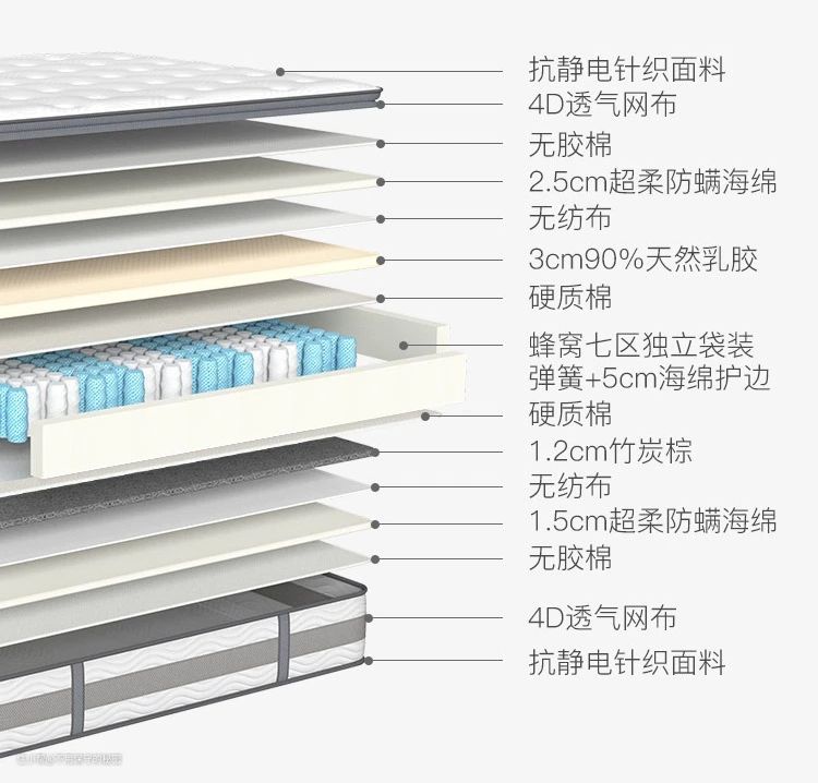 先来看看网易严选AB面床垫的解析图,从静电面料到独立弹簧,每一层严谨筛选优质原料。主要就是两面均采用抗静电面料,防螨虫海绵,A面3厘米的泰国天然乳胶,B面1.2厘米竹炭棕,以及中间928个独立袋装弹簧。