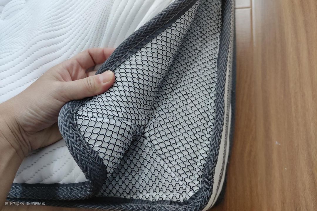 侧面还有乳胶面的边缘,可以看到蜂窝状结构的4D透气网布,气孔大,透气性好。像我晚上睡觉爱出汗,湿气就不容易排出,AB面床垫大面积的透气孔,加上4D透气网布,就能加快汗液和湿气的排出,保持床垫的干爽。
