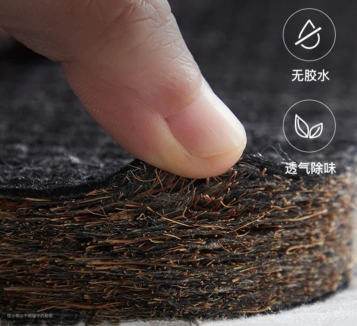 网易严选AB面乳胶弹簧床垫的B面是椰棕面,1.2厘米厚度,一般老人家会喜欢硬板,所以会喜欢这一面。热压成型不含胶水,并添加了护脊竹炭微粒,具有吸湿除味的特点。