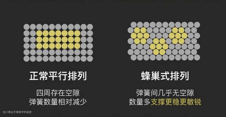 前面有说,我家之前的床垫是非独立弹簧,夜里一边稍微翻身动一下,另外一边就有非常大明显感觉,会被吵醒。而网易严选AB面床垫采用928个独立袋装弹簧,无空隙蜂巢式排列,为床垫提供更稳定的支撑力。