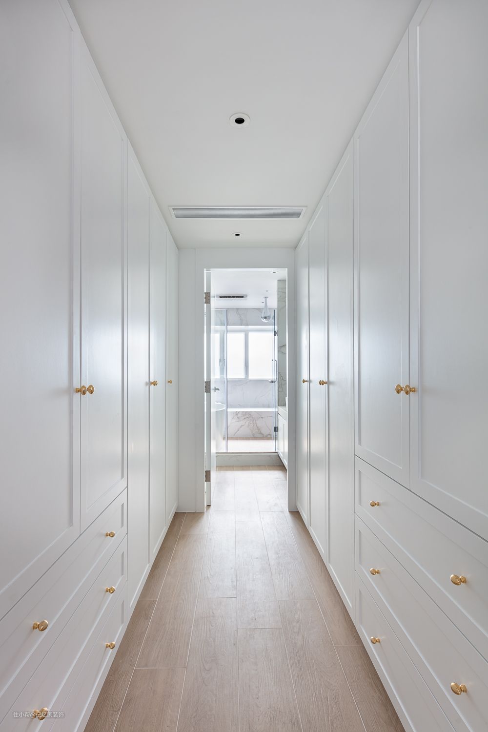 因为房价的高涨,步入式衣帽间越来越受到大家的喜欢。因为步入式衣帽间有强大的收纳功能和超高的颜值,很多家庭在设计步入式衣帽间时,会遇到衣帽间的位置恰好联通卫生间,这种情况该怎么设计?