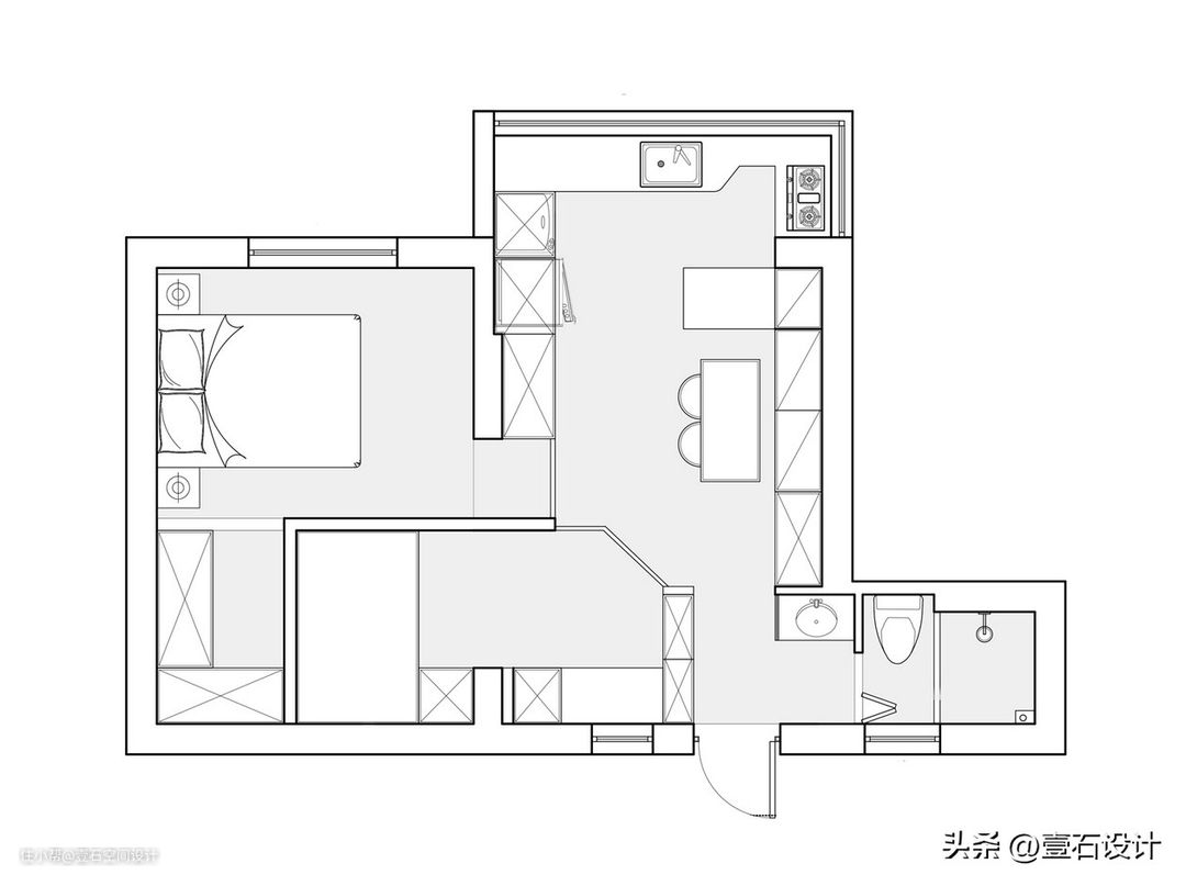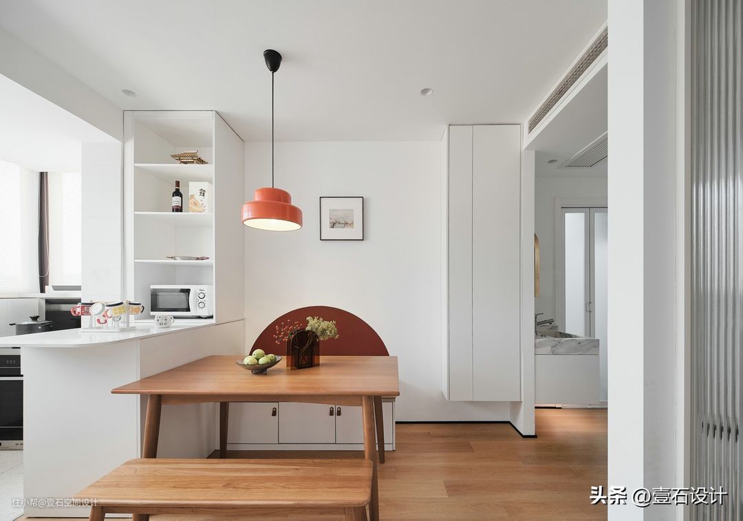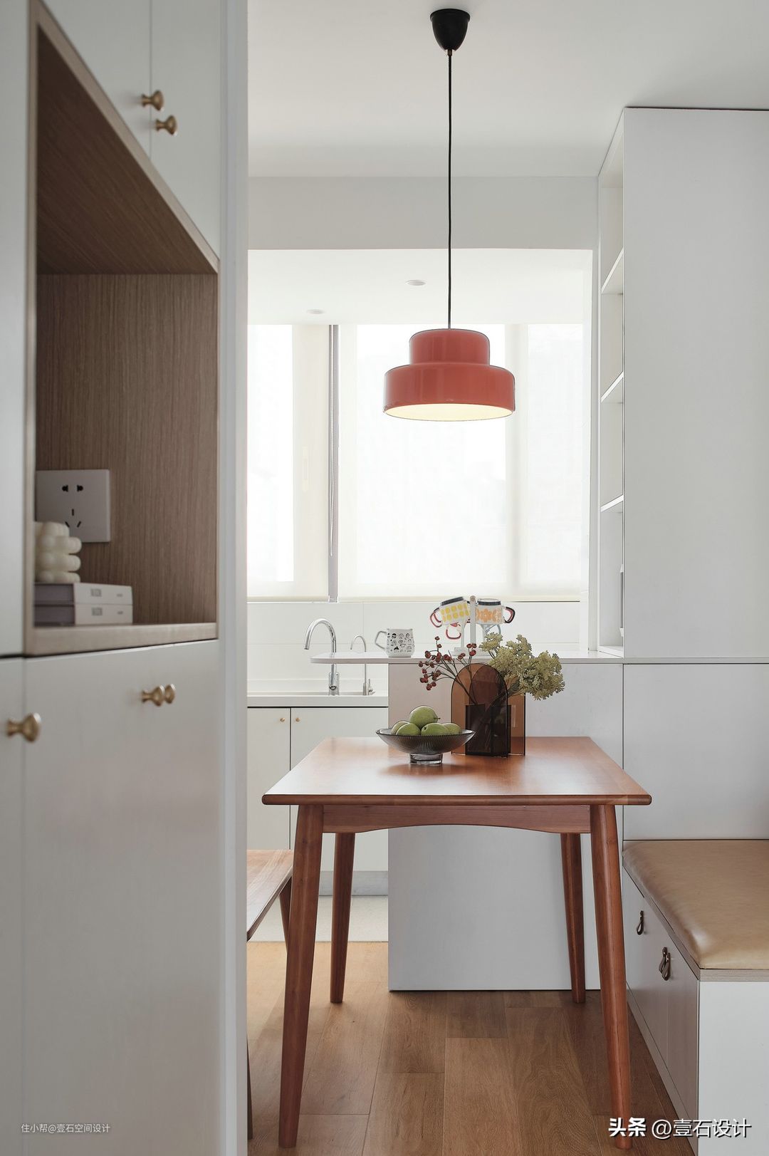 厨餐厅一体化设计,为了充分利用空间,冰箱洗衣机嵌入柜体里,让小空间保持整体感。
