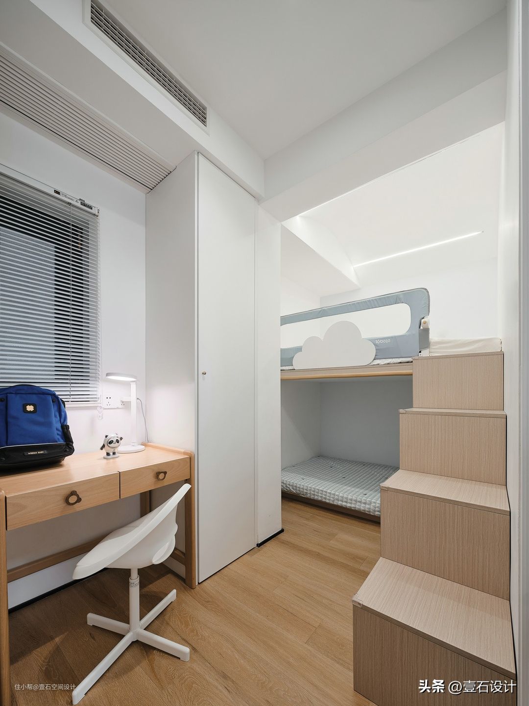 上下铺设计,小楼梯也是储物格子柜。采用木白搭配,局部的蓝色点缀,恰好的宁静。