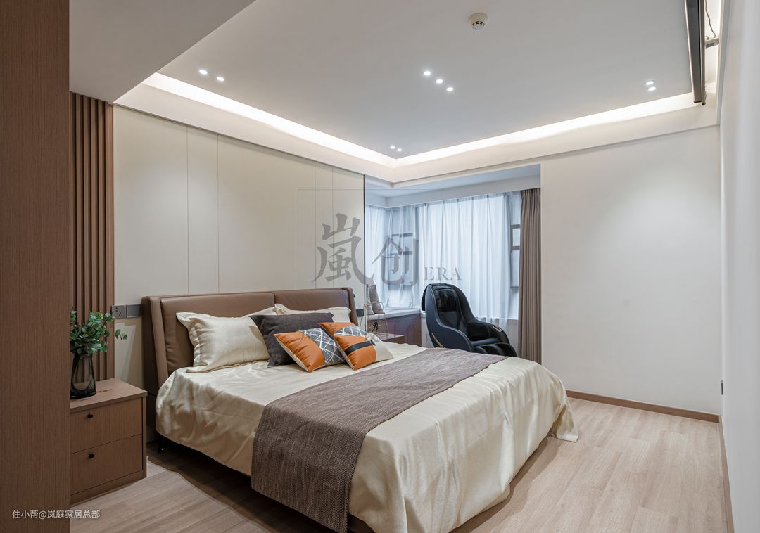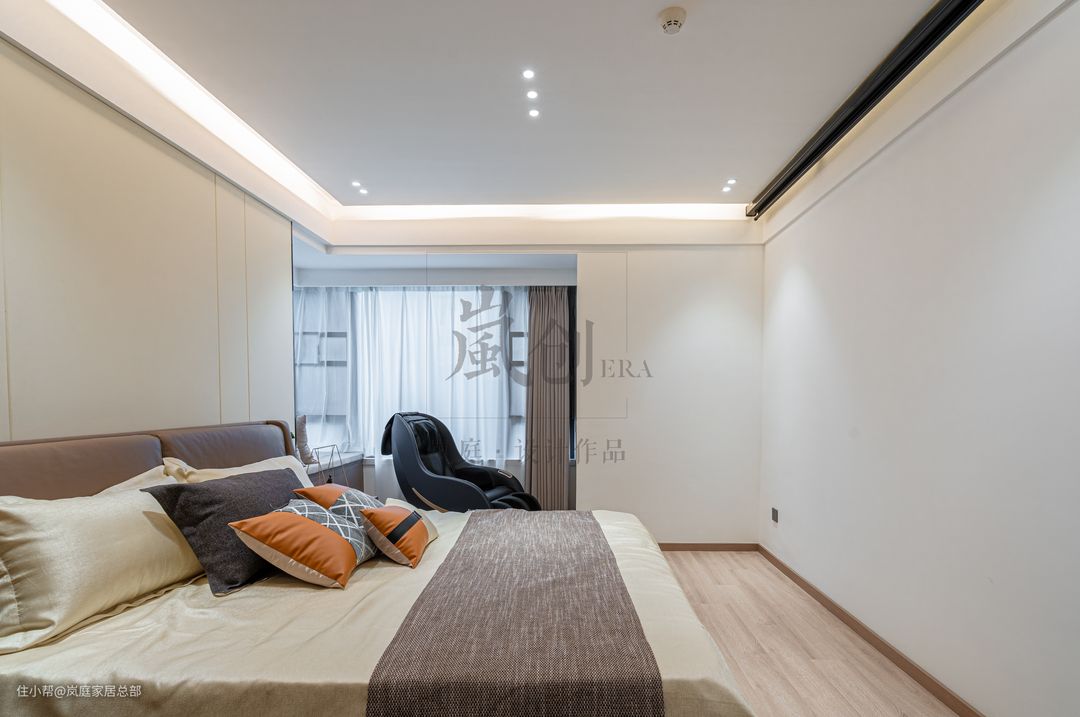 卧室同样延续了公区的无主灯设计,平面吊顶,搭配灯带和射灯做照明,对于卧室这样不算特别大的空间来说更实用,不压层高,不会显得拥挤。