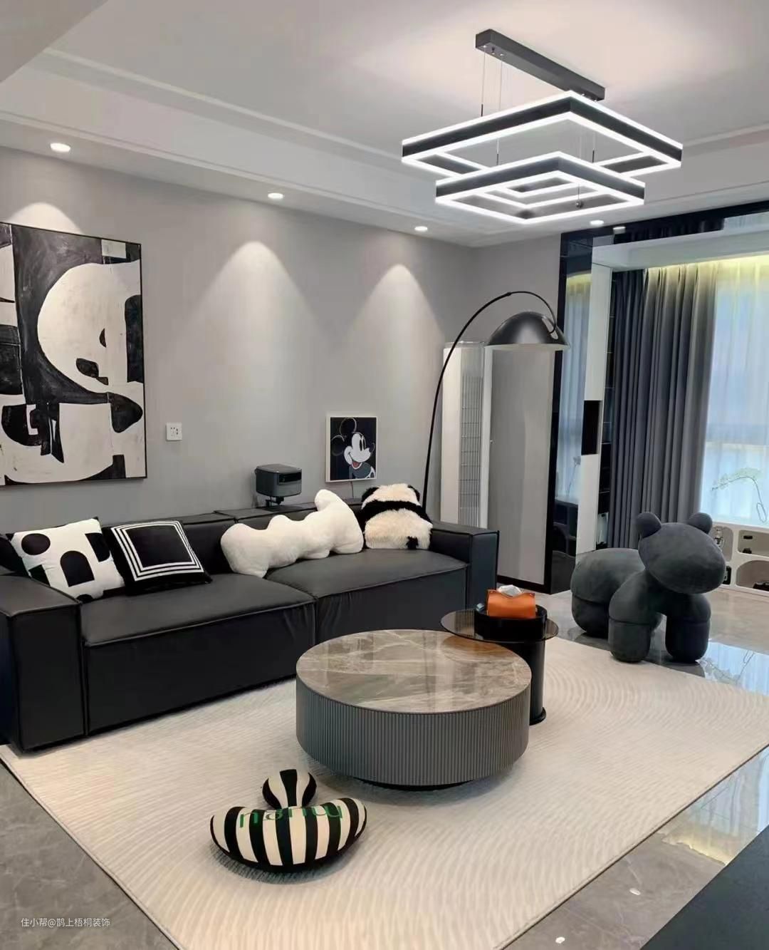 黑色沙发简约耐看,圆形简约大理石面茶几很有装饰感,潮玩动物凳迎合了当下潮流。钓鱼落地灯设计拉升了空间感,浅灰色地毯和黑色沙发让客厅显得既沉稳而又不失时尚