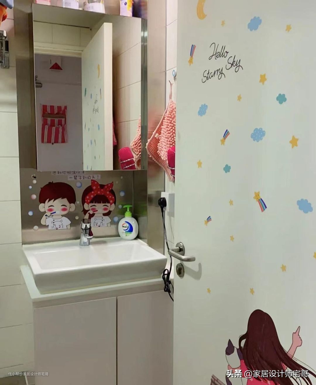 下面的墙上贴着两个卡通图案,也象征着他们一儿一女的幸福吧!
