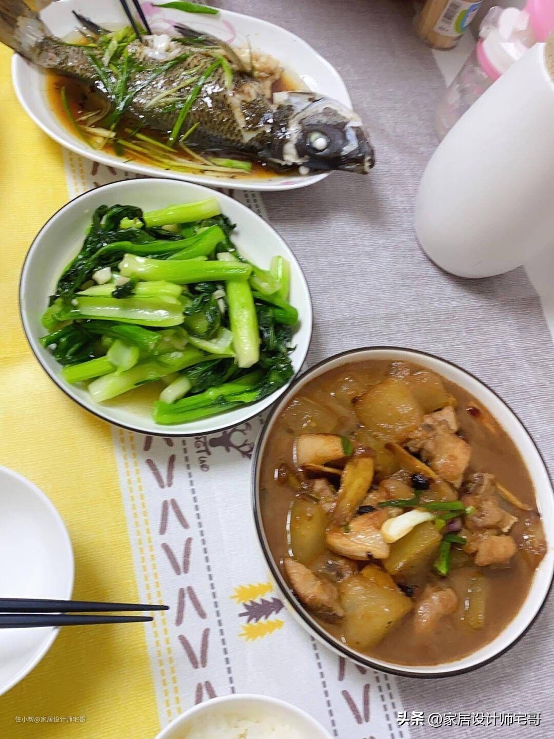 女主人每天都会为一家人准备上几道营养又家常的小菜,一家人围坐在一起,其乐融融地享受着美食,非常的幸福温馨。