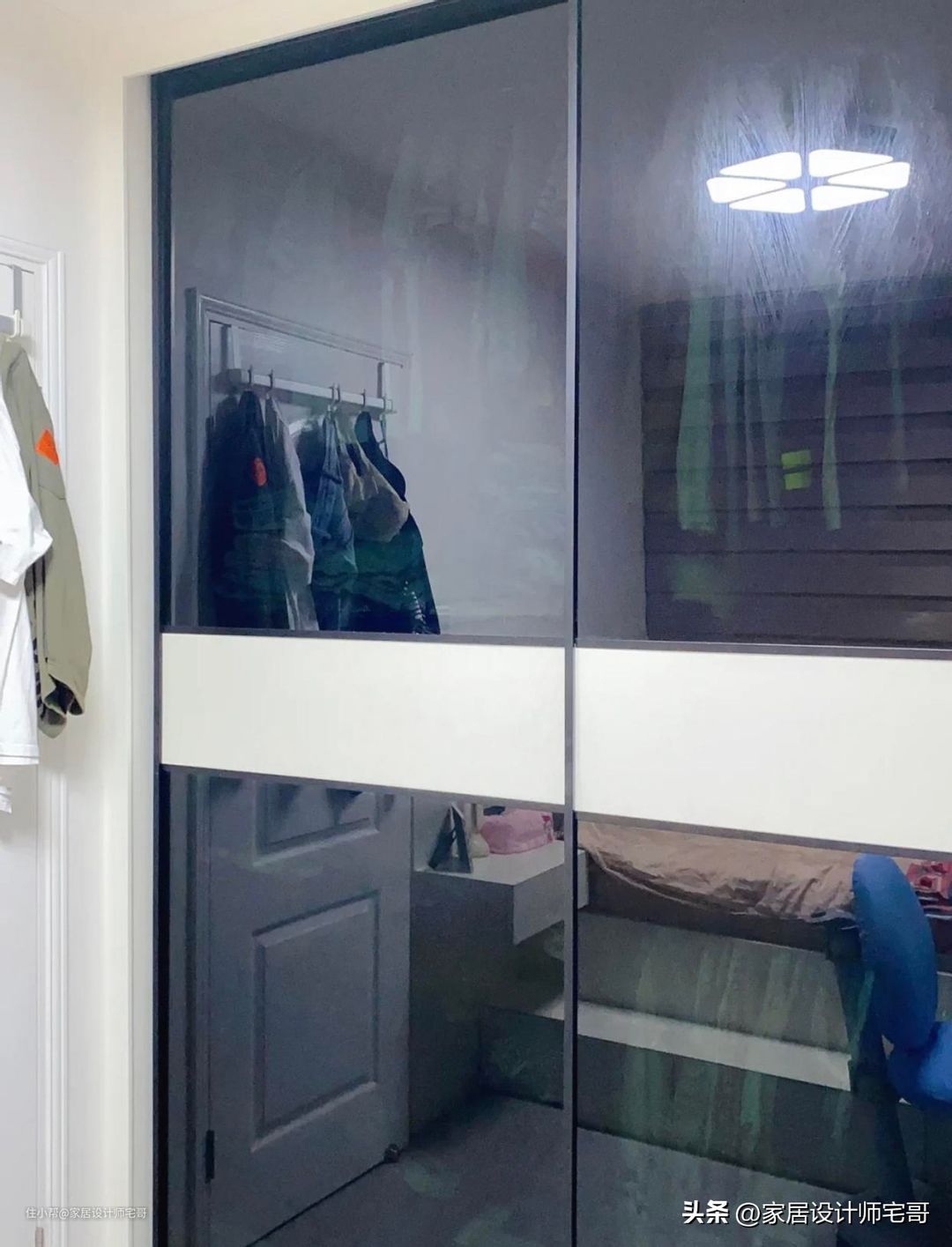 主卧的另一边是衣柜,柜门做了镜面的效果,这样使整个小空间起来能够更加宽敞一些。