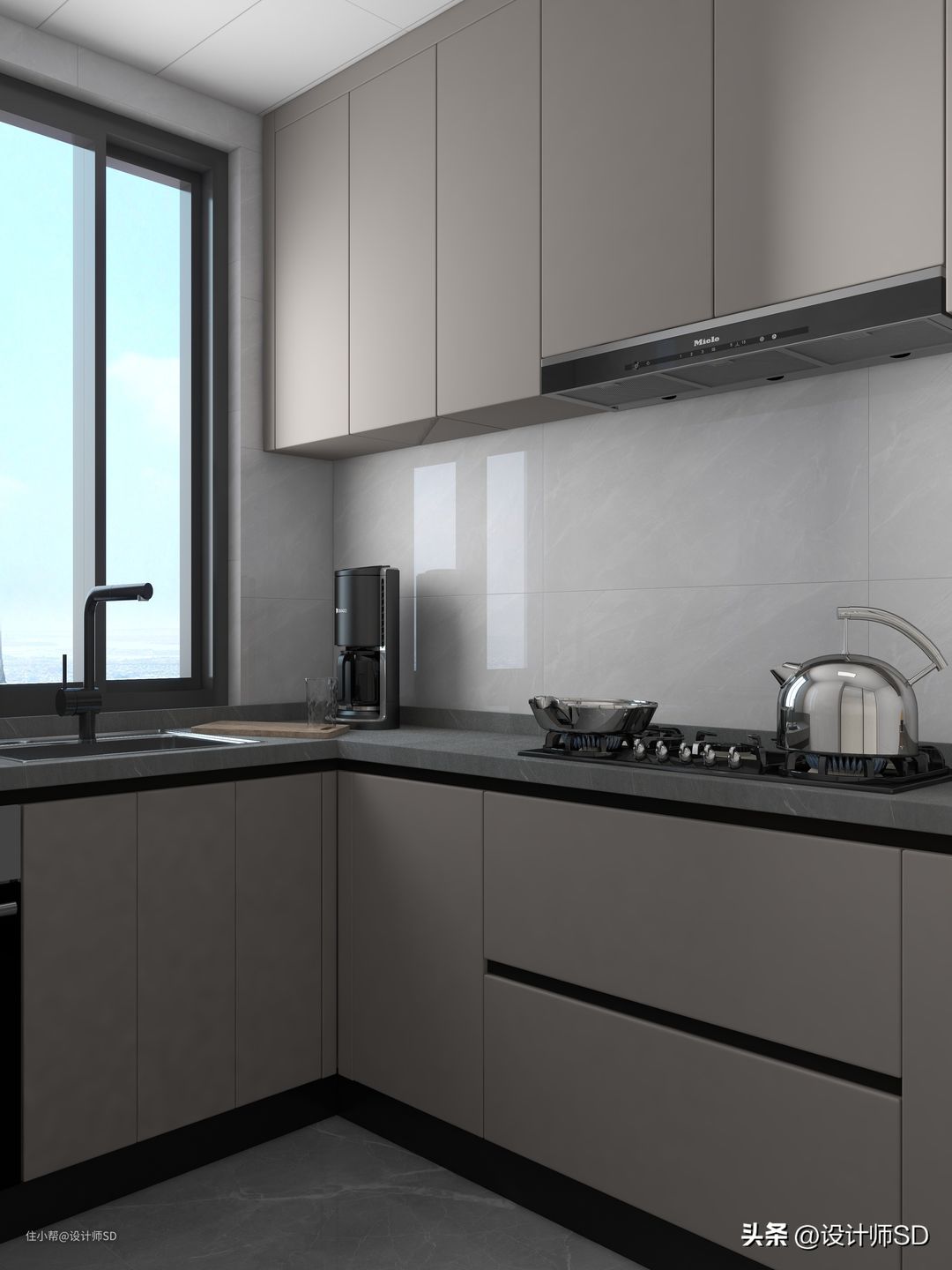 厨房的地面砖是跟客餐厅通铺进来的,墙面则是铺贴浅灰色的墙砖,下方的地柜做的是L型的,左边做洗菜,依次是切菜,炒菜,还有厨房小电器的操作台面,下面的柜门搭配素色的柜门,台面的石英石实用深灰色的,上方的吊柜实用素色的柜体跟柜门,在右侧还布置了两扇黑色边框的玻璃柜门,整个厨房看上去干净清爽又有精致感。