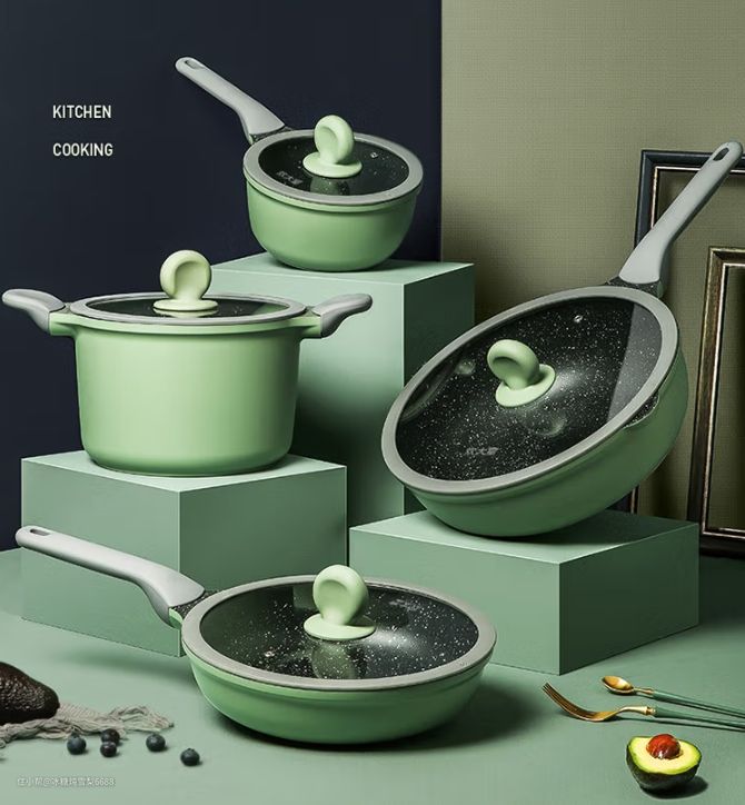 曾经获得设计大奖的一款锅。炊大皇这款的外观就很有特色,竹青石的配色,浓浓中国风。四件套包含炒锅、煎锅、奶锅和汤锅,性价比超高。硅胶都是密封设计的,充分包边不泄露,可以充分保持食物的滋味,手柄防烫,体现了人性化。499元即可入手的一款,凑单的话还可以更优惠。