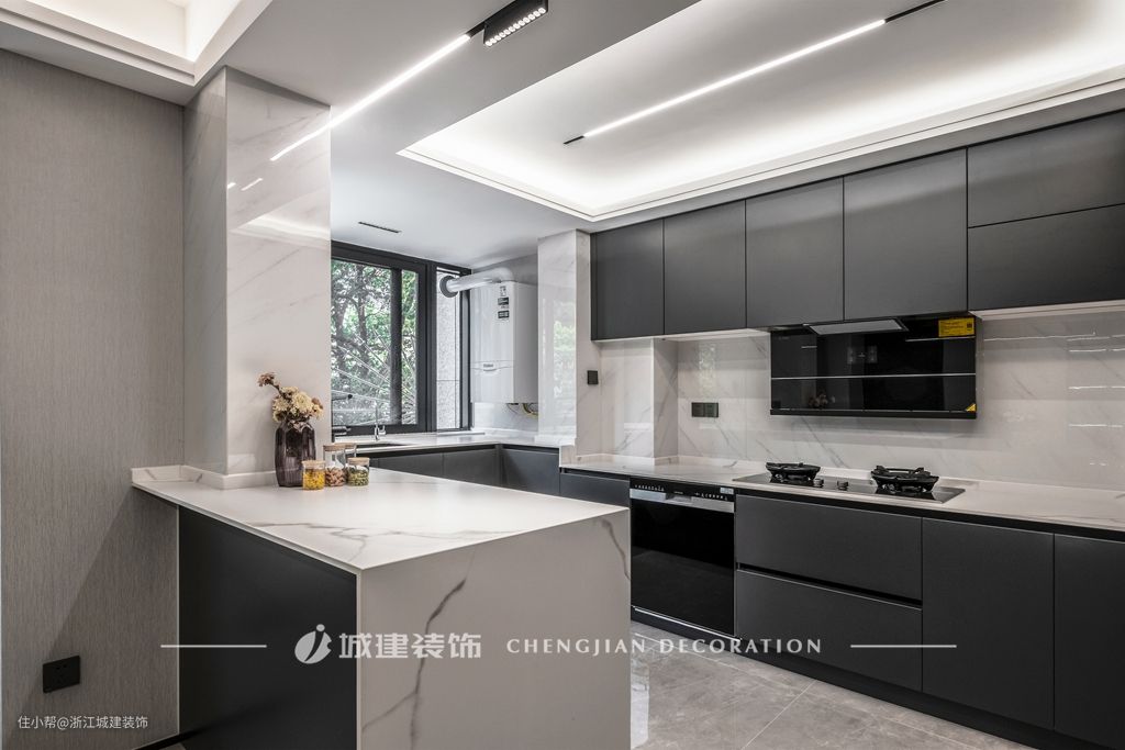 开放式厨房,视觉上扩大空间,采光更通透。深灰色柜门搭配白色大理石台面,时尚摩登;隐形拉手设计,极简纯粹。充分利用空间,在厨房与餐厅之间加入岛台,增加更到生活功能,可以是料理台也可以是休闲小吧台。
