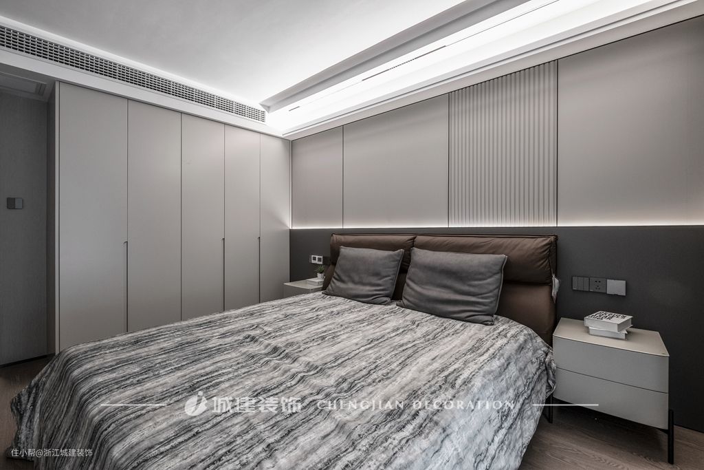 深灰色半高床头背板、浅灰色格栅+硬包、同色系极简衣柜,递进的层次打造高级感的意式空间;冷色基调下,床选择了中性暖调的咖色,如冬日里,手捧一杯热咖啡,醇香温暖。无主灯设计,隐藏式光源光线柔和,卧室更有氛围感。