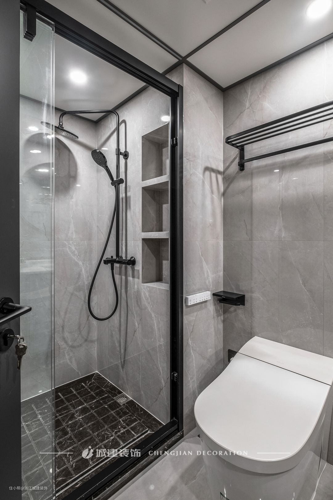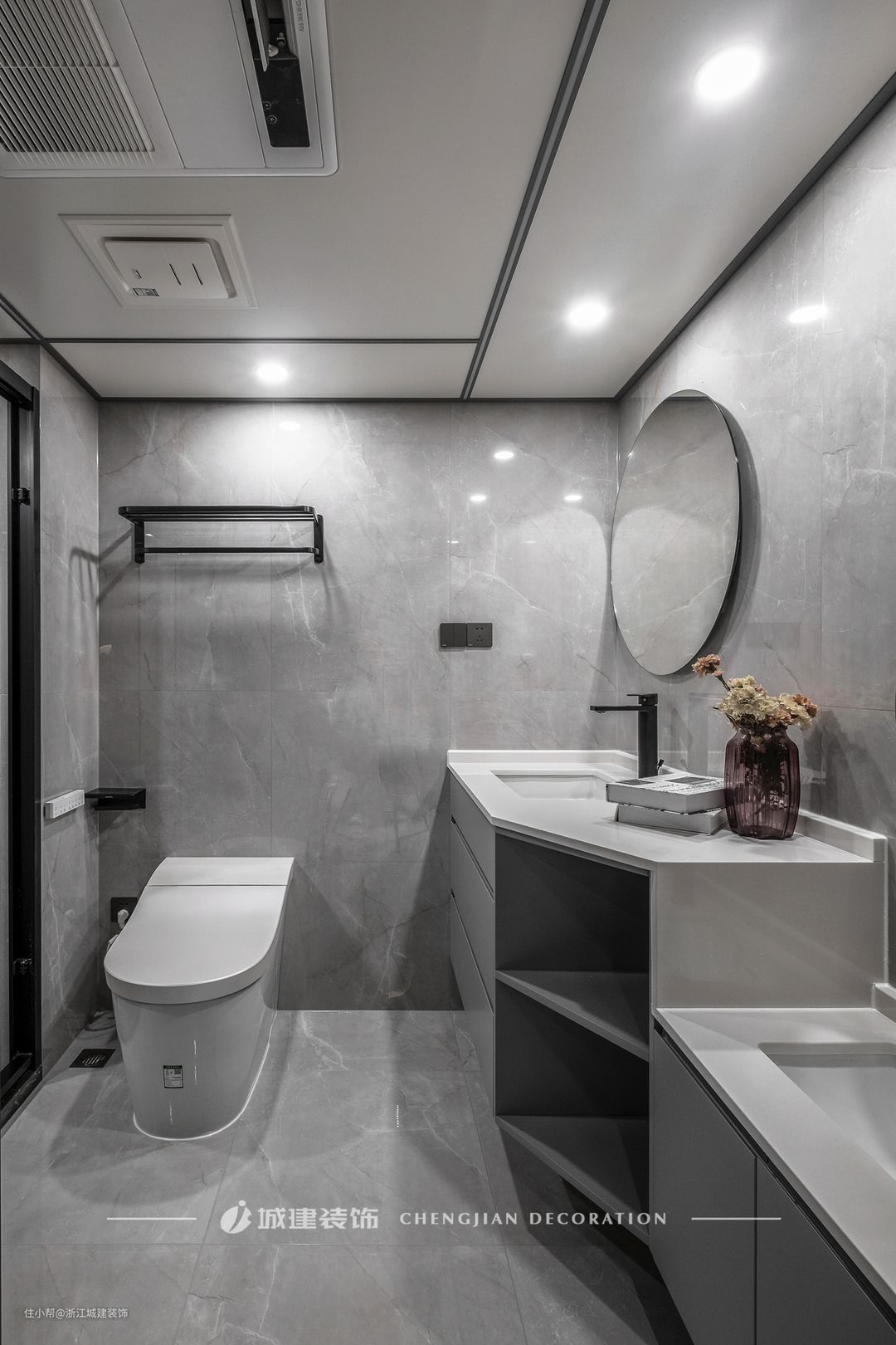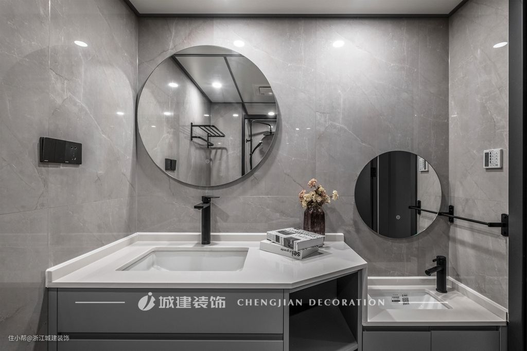 灰色的空间,大气 时尚;定制的高低浴室柜,满足不同需求,增加亲子互动。