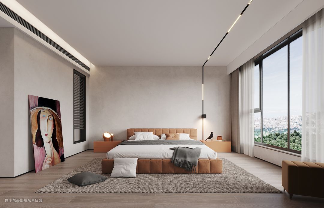 主卧设计当中,运用留白营造平和感,艺术画的运用则创造了视觉焦点,将浪漫的空间气息营造出来