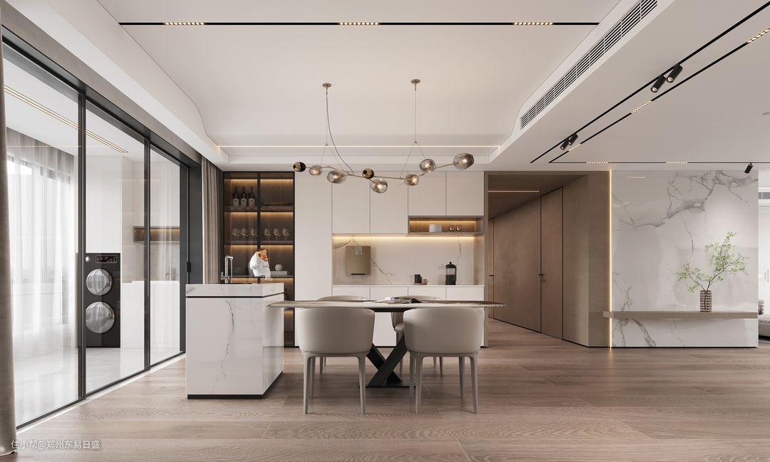 同样的运用了色彩和体块儿的虚实对比,岩板餐桌搭配上奶咖色皮质座椅,氛围感餐厅瞬间就来了