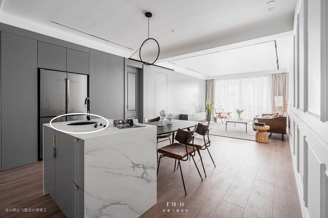 这方面毛坯房和精装房是不同的,毛坯房可以跟师傅说好提前排线就行。而精装房则要复杂一些,墙面和地面全部都要重新开槽,将电线接入岛台底部位置,然后从柜体和石材的中间穿过能更加美观不碍事,注意电源线至少要在2.5平方以上,即使使用了大功率电器也不怕。