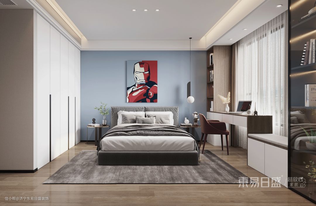 老人房用色沉稳朴质,米色柔和,灰色大气,勾勒舒适尊享的氛围,榻榻米+衣柜+书桌的组合设计,可以最大程度利用空间,丰富空间功能。现代简约形吊灯,烘托起温馨有爱的生活场景,每一个细节都源于设计师的温暖和用心。