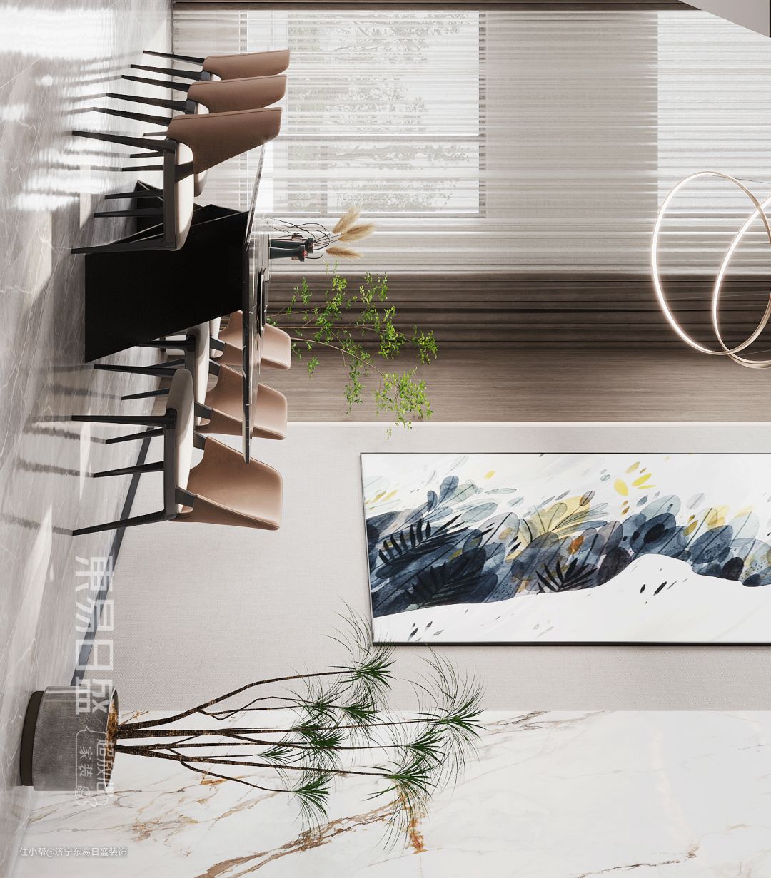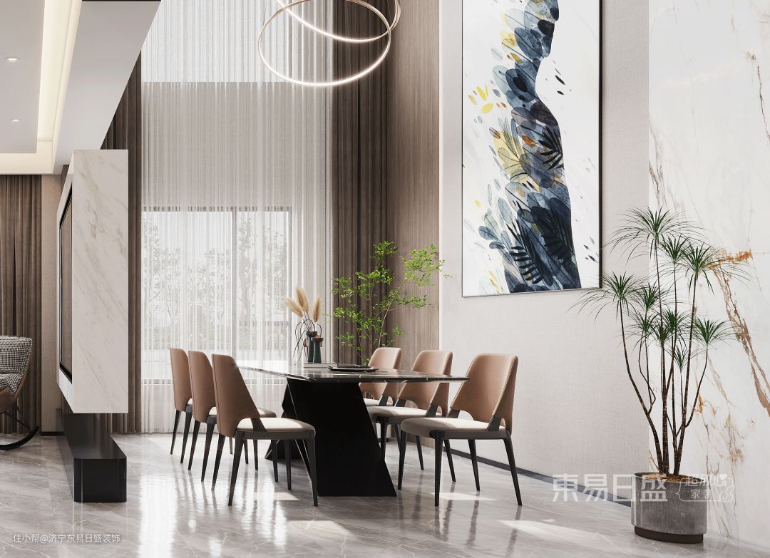 餐厅区域做挑空,搭配简约线条型吊灯,墙面是护墙板与大理石相结合,让整个空间层次丰富,大气明亮。搭配软装挂画装饰品,为空间增添一景。餐厅落地窗将景观带入室内,使外景成为室内的一部分。