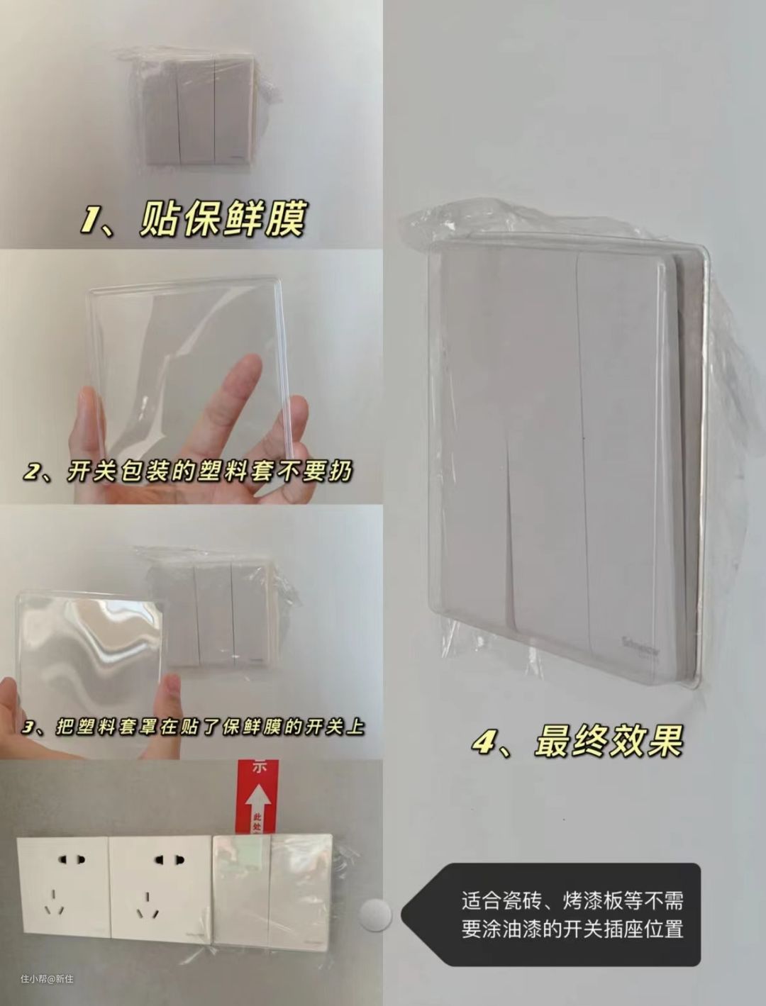延伸阅读:开关的地方,美纹纸和保鲜膜之间不要贴太紧,避免压到开关无法正常开合。