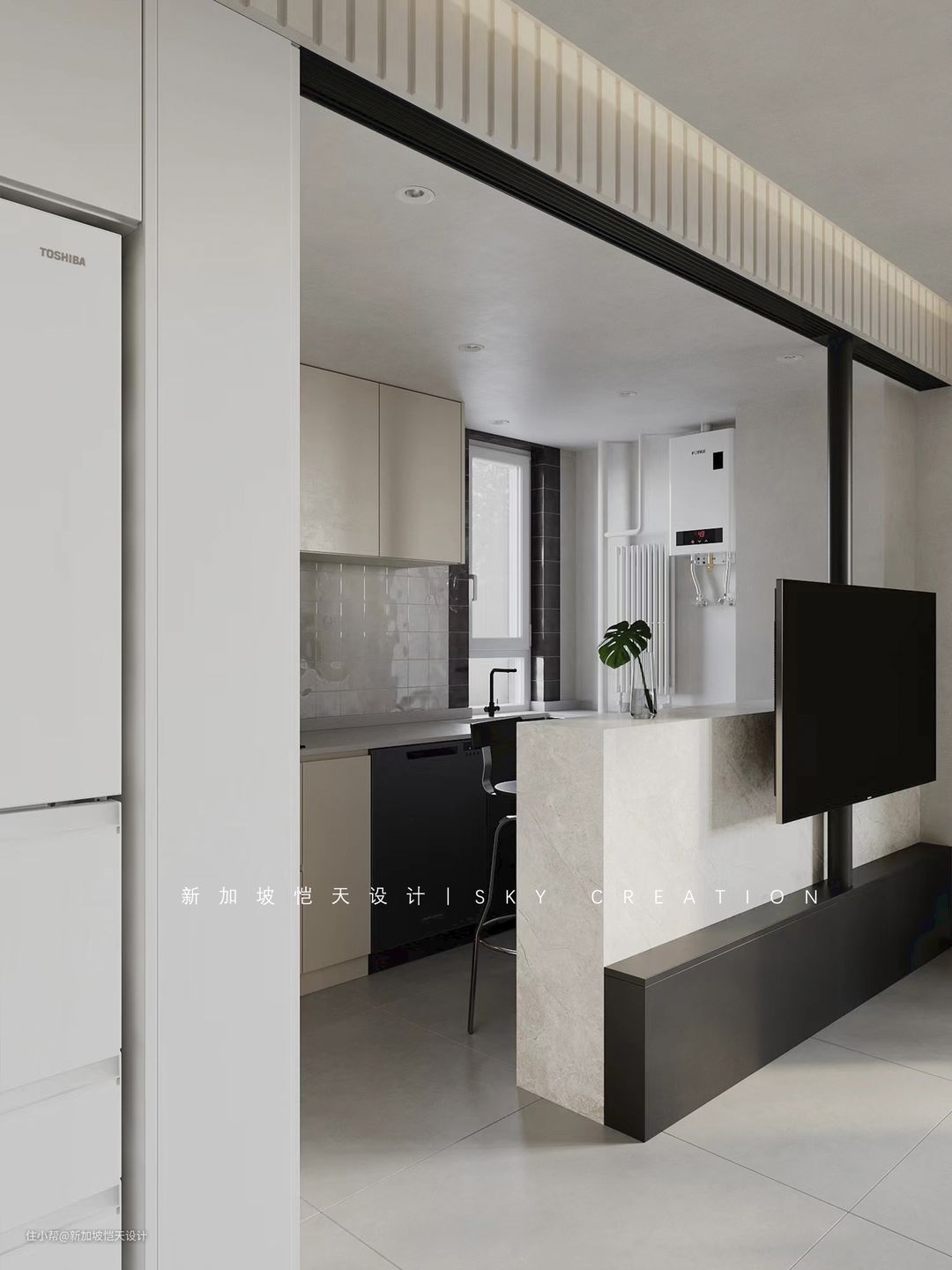 这个案例把客厅和厨房打通,留下半堵墙,做小吧台或传菜区,空间通透、采光更好的同时,还给这个空间新增了吧台功能。