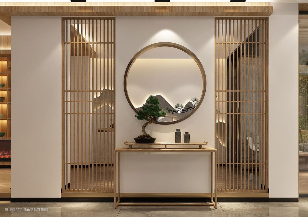 通过上面的案例,我们发现中式装修风格的玄关常常采用盆景作为主体,与运用中国山水元素的主墙面相得益彰。盆景在我国发展已久,盆景已经过多年培育,生长缓慢,大多数树种耐阴,是非常适合在玄关等光线不足的地方摆放的。