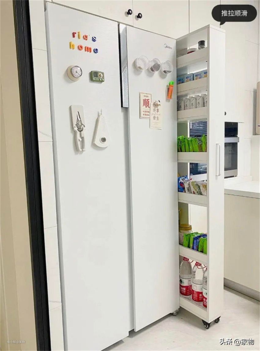 冰箱靠墙放或者靠柜子放,旁侧总会留有一个小缝隙,与其空着不如利用上,定制10-15cm抽拉柜摆放在侧边,既不突兀又便捷使用,储物容量瞬间翻倍。